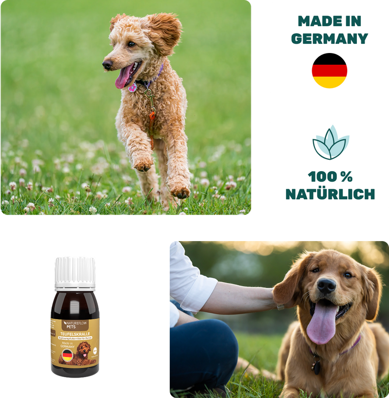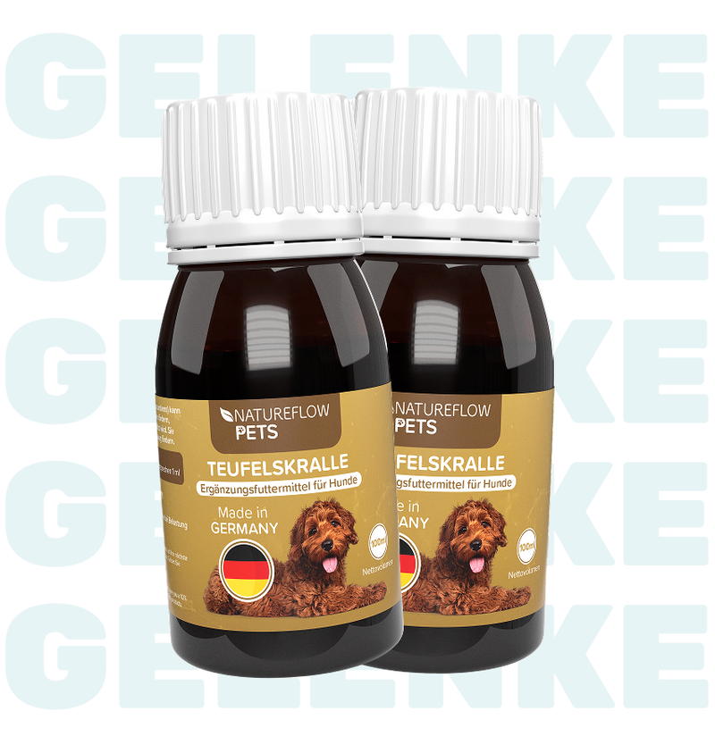 Die afrikanische Teufelskralle (Harpagophytum procumbens) wird seit Jahrhunderten in der traditionellen Pflanzenkunde eingesetzt, um Gelenke und Sehnen zu stärken. In Natureflow Pets Gelenk Teufelskralle nutzen wir einen hochkonzentrierten Extrakt, der deinem Hund dabei hilft, geschmeidige Gelenke zu behalten und typischen Alterserscheinungen wie Belastungssteifheit sanft entgegenzuwirken.