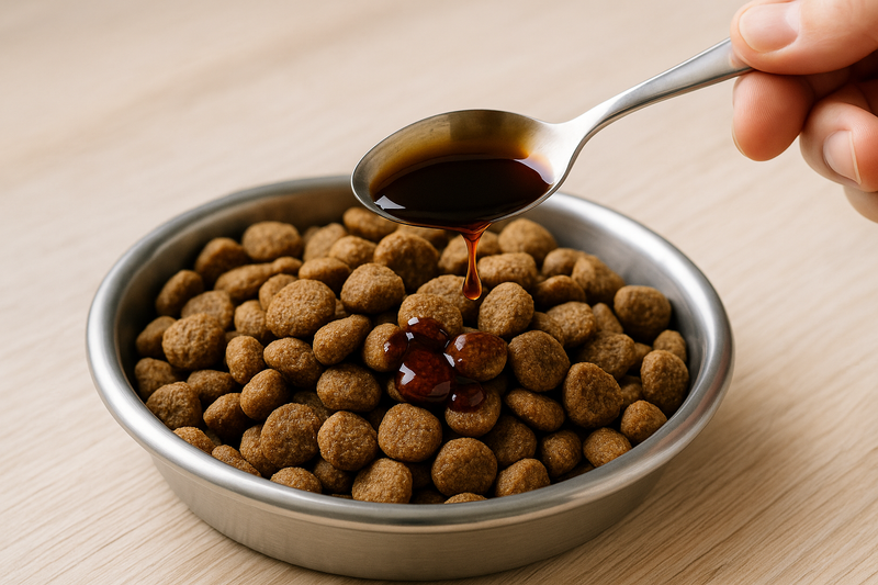 Einfach über das Futter träufeln - fertig. Kein komischer Geruch, keine Akzeptanzprobleme, kein Stress für dich als Hundebesitzer/in.